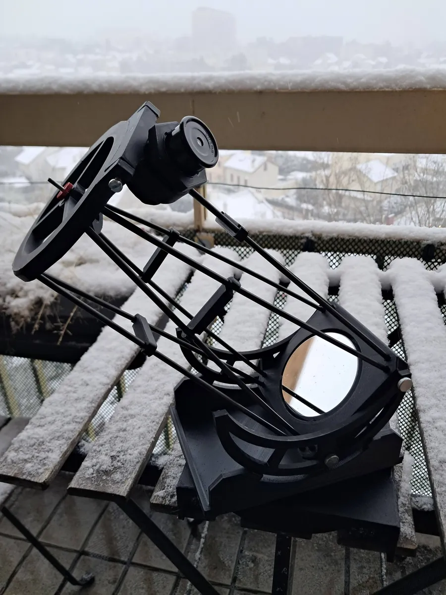 This is a 3D-printed dobsonian telescope built around a 76mm/300mm parabolic mirror kit. While there are plenty of mini-scope models on the internet, I wanted something that looked like a dobson that went a bit too hard through the clothes dryer, but without compromise on what matters: